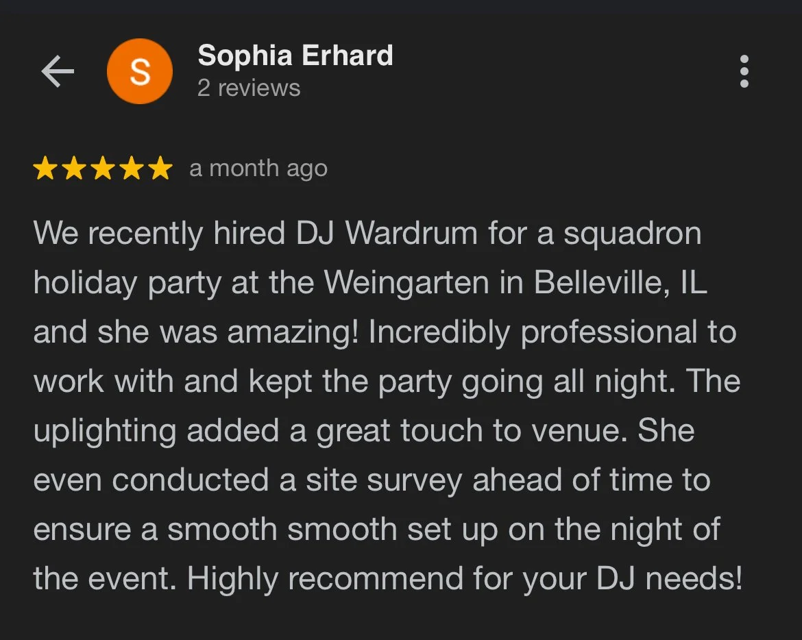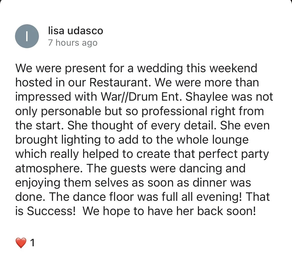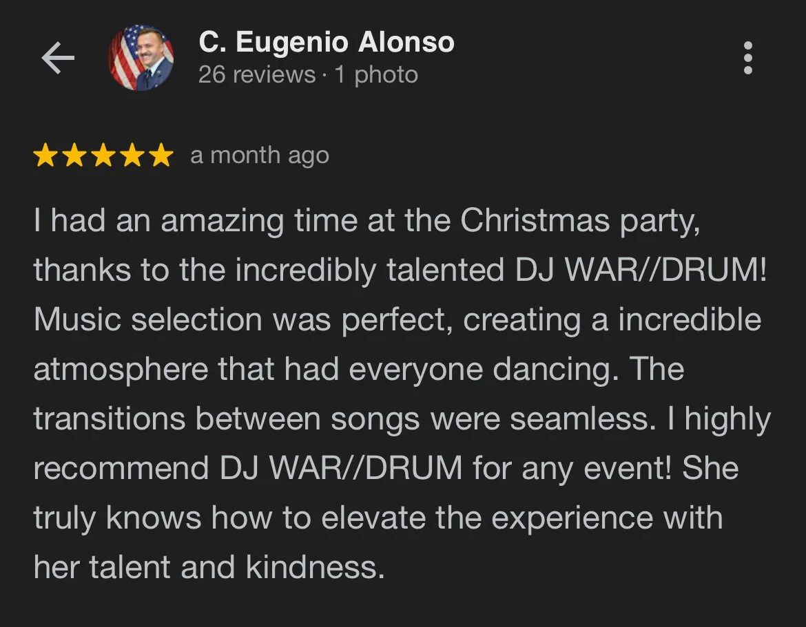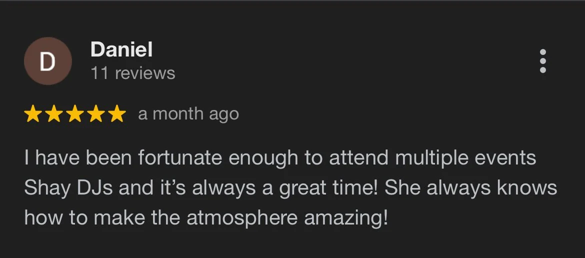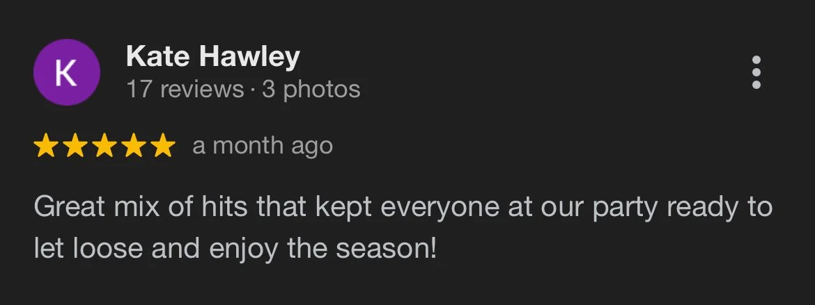 Google Maps “PROFESSIONAL RIGHT FROM THE START...THE DANCE FLOOR WAS FULL ALL EVENING!” “MUSIC SELECTION WAS PERFECT, CREATING AN INCREDIBLE ATMOSPHERE THAT HAD EVERYONE DANCING.” “ONE OF THE BEST DJS EVER! SHE MADE OUR WEDDING PERFECT.”