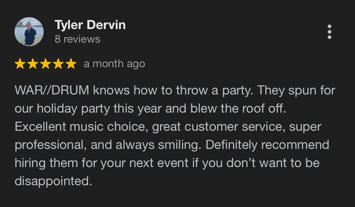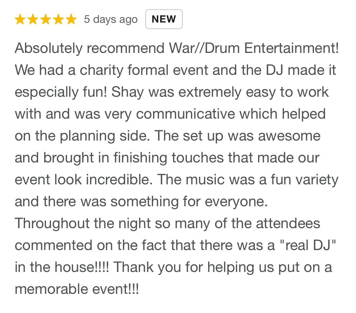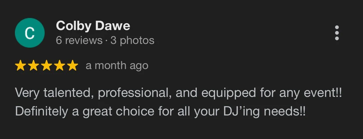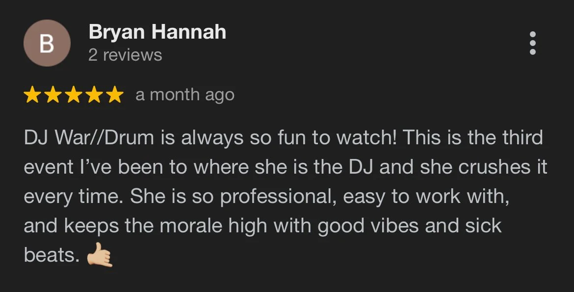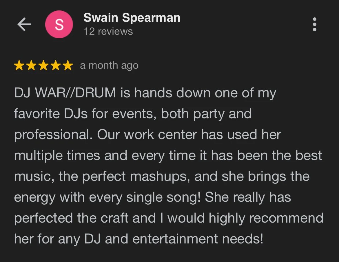 Google Maps “PROFESSIONAL RIGHT FROM THE START...THE DANCE FLOOR WAS FULL ALL EVENING!” “MUSIC SELECTION WAS PERFECT, CREATING AN INCREDIBLE ATMOSPHERE THAT HAD EVERYONE DANCING.” “ONE OF THE BEST DJS EVER! SHE MADE OUR WEDDING PERFECT.”
