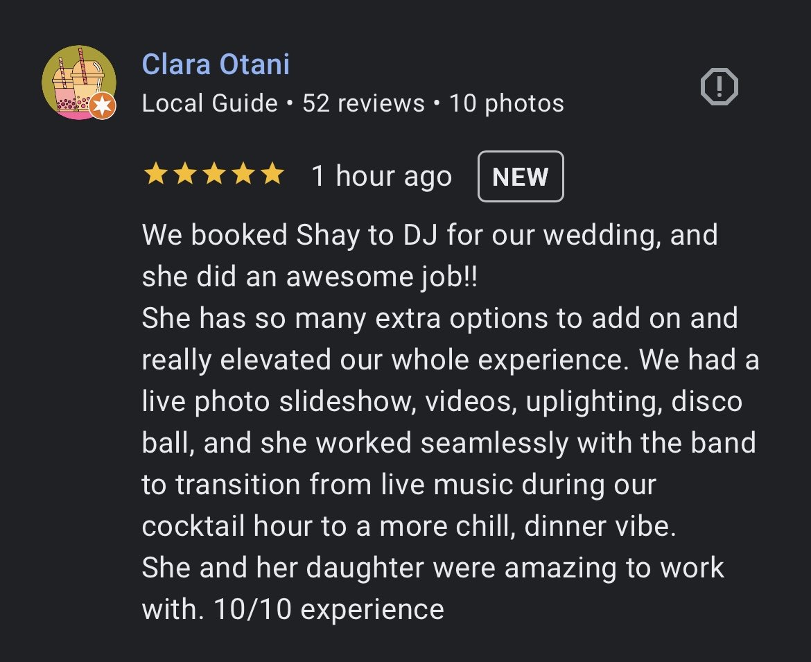 Google Maps “PROFESSIONAL RIGHT FROM THE START...THE DANCE FLOOR WAS FULL ALL EVENING!” “MUSIC SELECTION WAS PERFECT, CREATING AN INCREDIBLE ATMOSPHERE THAT HAD EVERYONE DANCING.” “ONE OF THE BEST DJS EVER! SHE MADE OUR WEDDING PERFECT.”
